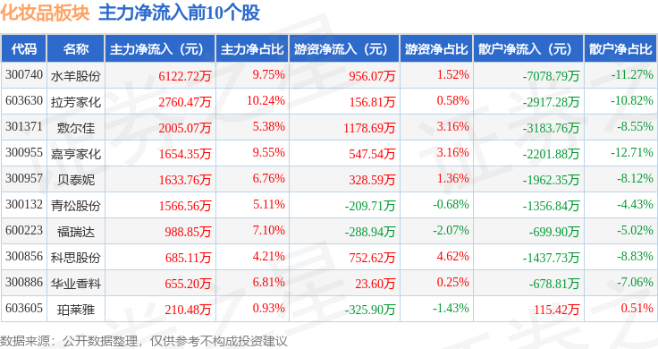 从资金流向上来看,当日化妆品板块主力资金净流入1.5亿元,游资资金净流入3709.43万元,散户资金净流出1.88亿元。化妆品板块个股资金流向见下表: