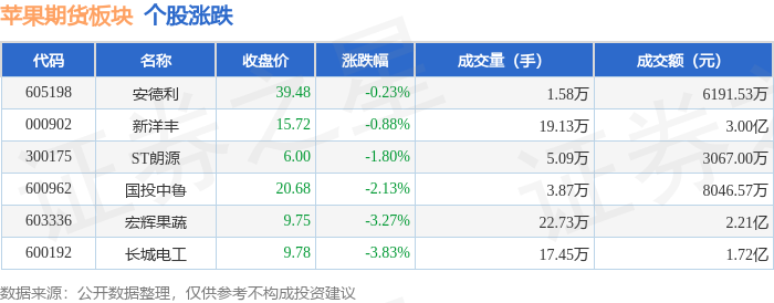 证券之星消息,11月18日苹果期货板块较上一交易日下跌1.52%,长城电工领跌。当日上证指数报收于3939.81,下跌0.81%。深证成指报收于13080.49,下跌0.92%。苹果期货板块个股涨跌见下表: