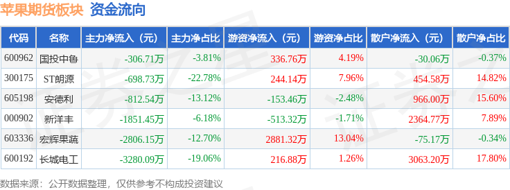 从资金流向上来看,当日苹果期货板块主力资金净流出9755.66万元,游资资金净流入3012.33万元,散户资金净流入6743.34万元。苹果期货板块个股资金流向见下表: