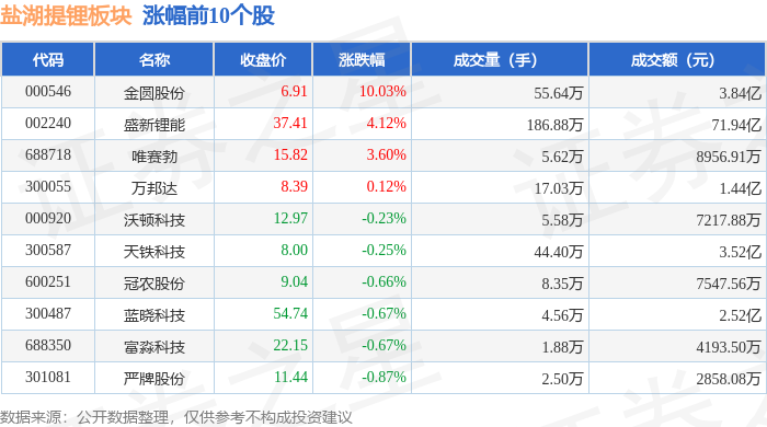 证券之星消息,11月18日盐湖提锂板块较上一交易日下跌2.95%,富临精工领跌。当日上证指数报收于3939.81,下跌0.81%。深证成指报收于13080.49,下跌0.92%。盐湖提锂板块个股涨跌见下表: