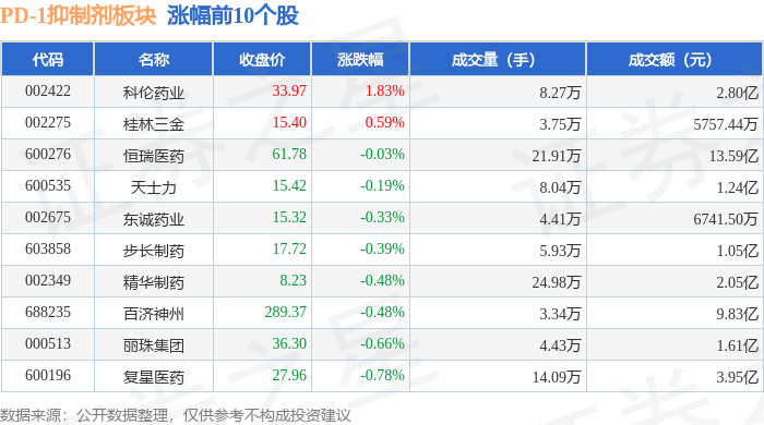 证券之星消息,11月18日PD-1抑制剂板块较上一交易日下跌0.56%,誉衡药业领跌。当日上证指数报收于3939.81,下跌0.81%。深证成指报收于13080.49,下跌0.92%。PD-1抑制剂板块个股涨跌见下表: