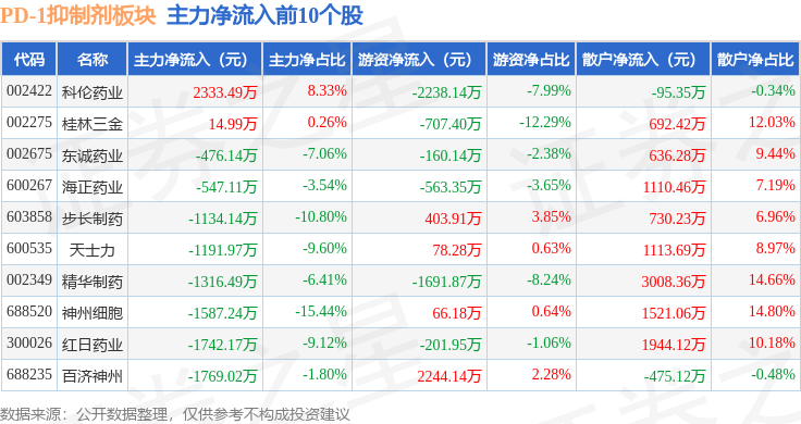 从资金流向上来看,当日PD-1抑制剂板块主力资金净流出9.45亿元,游资资金净流入3.42亿元,散户资金净流入6.03亿元。PD-1抑制剂板块个股资金流向见下表: