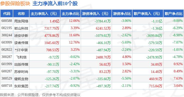 从资金流向上来看,当日参股保险板块主力资金净流出14.24亿元,游资资金净流入3.92亿元,散户资金净流入10.32亿元。参股保险板块个股资金流向见下表: