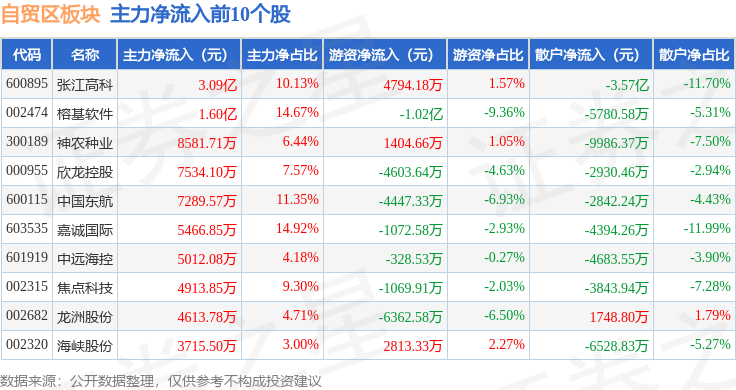 从资金流向上来看,当日自贸区板块主力资金净流出54.63亿元,游资资金净流入10.8亿元,散户资金净流入43.84亿元。自贸区板块个股资金流向见下表: