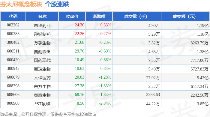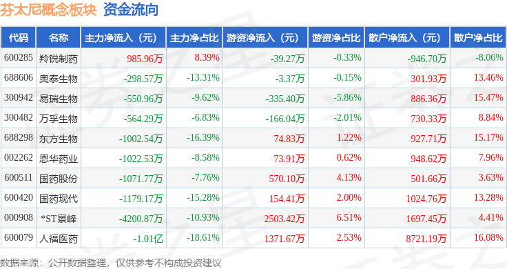 从资金流向上来看,当日芬太尼概念板块主力资金净流出1.9亿元,游资资金净流入4204.28万元,散户资金净流入1.48亿元。芬太尼概念板块个股资金流向见下表:
