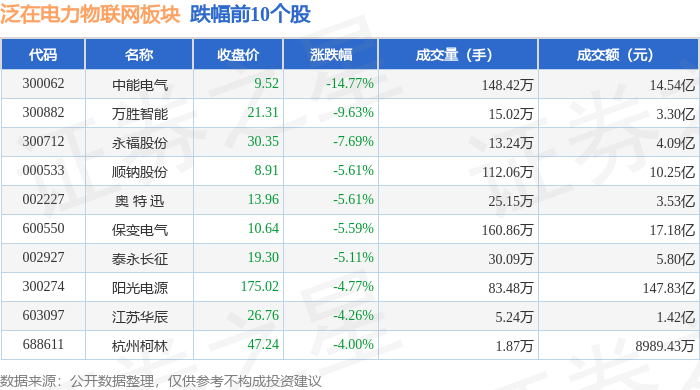 证券之星消息,11月18日泛在电力物联网板块较上一交易日下跌1.63%,中能电气领跌。当日上证指数报收于3939.81,下跌0.81%。深证成指报收于13080.49,下跌0.92%。泛在电力物联网板块个股涨跌见下表: