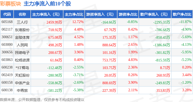 从资金流向上来看,当日彩票板块主力资金净流出1.5亿元,游资资金净流入9954.95万元,散户资金净流入5045.43万元。彩票板块个股资金流向见下表: