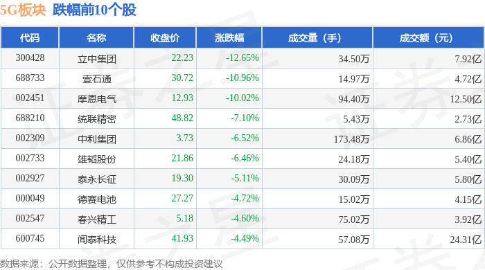 证券之星消息,11月18日5G板块较上一交易日下跌0.14%,立中集团领跌。当日上证指数报收于3939.81,下跌0.81%。深证成指报收于13080.49,下跌0.92%。5G板块个股涨跌见下表: