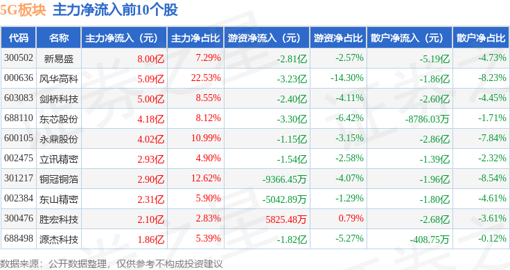从资金流向上来看,当日5G板块主力资金净流入4.6亿元,游资资金净流出3.55亿元,散户资金净流出1.05亿元。5G板块个股资金流向见下表: