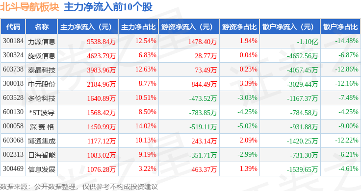 从资金流向上来看,当日北斗导航板块主力资金净流出18.07亿元,游资资金净流入2.27亿元,散户资金净流入15.8亿元。北斗导航板块个股资金流向见下表: