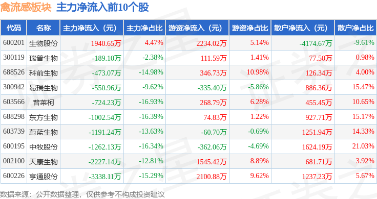 从资金流向上来看,当日禽流感板块主力资金净流出1.91亿元,游资资金净流入1.04亿元,散户资金净流入8743.76万元。禽流感板块个股资金流向见下表: