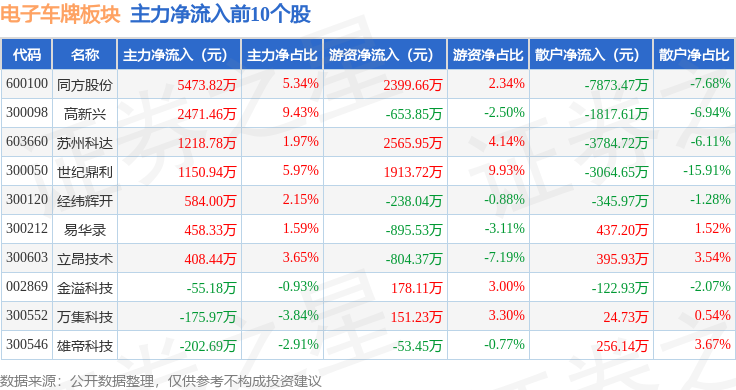 从资金流向上来看,当日电子车牌板块主力资金净流入930.28万元,游资资金净流入9620.16万元,散户资金净流出1.06亿元。电子车牌板块个股资金流向见下表: