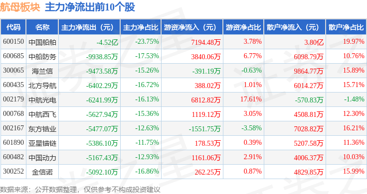 从资金流向上来看,当日航母板块主力资金净流出15.18亿元,游资资金净流入3.83亿元,散户资金净流入11.35亿元。航母板块个股资金流向见下表: