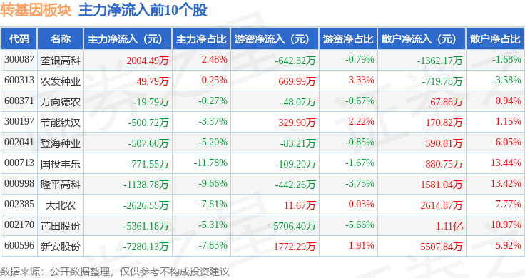 从资金流向上来看,当日转基因板块主力资金净流出2.63亿元,游资资金净流入1724.61万元,散户资金净流入2.46亿元。转基因板块个股资金流向见下表: