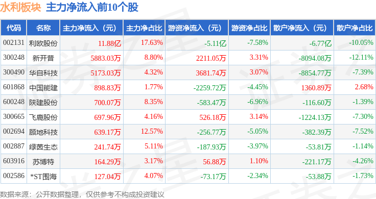 从资金流向上来看,当日水利板块主力资金净流出2618.5万元,游资资金净流出3.03亿元,散户资金净流入3.29亿元。水利板块个股资金流向见下表: