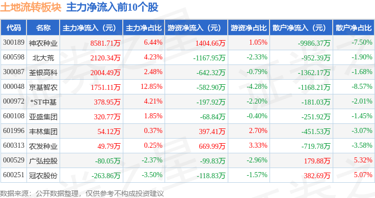 从资金流向上来看,当日土地流转板块主力资金净流出7.74亿元,游资资金净流入6742.24万元,散户资金净流入7.07亿元。土地流转板块个股资金流向见下表: