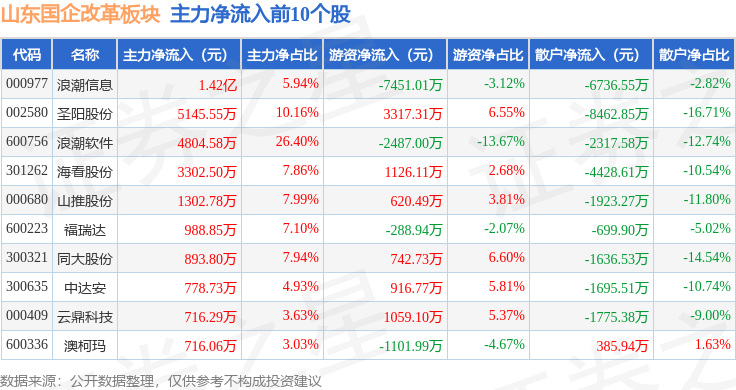 从资金流向上来看,当日山东国企改革板块主力资金净流出28.39亿元,游资资金净流入5.68亿元,散户资金净流入22.71亿元。山东国企改革板块个股资金流向见下表: