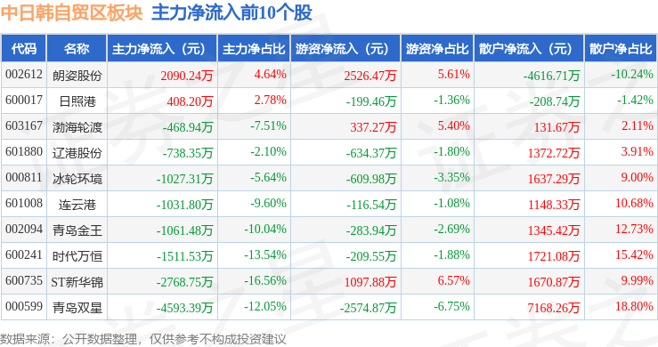 从资金流向上来看,当日中日韩自贸区板块主力资金净流出8.62亿元,游资资金净流入1.04亿元,散户资金净流入7.57亿元。中日韩自贸区板块个股资金流向见下表: