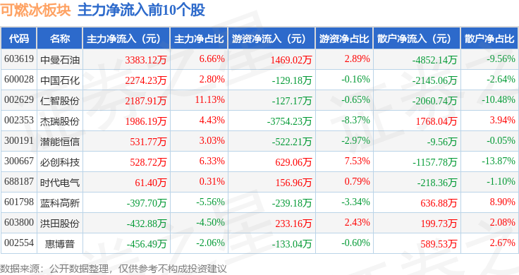 从资金流向上来看,当日可燃冰板块主力资金净流出8.37亿元,游资资金净流入1.76亿元,散户资金净流入6.62亿元。可燃冰板块个股资金流向见下表: