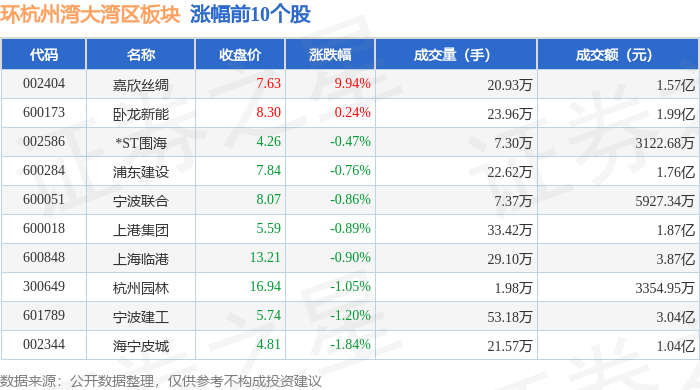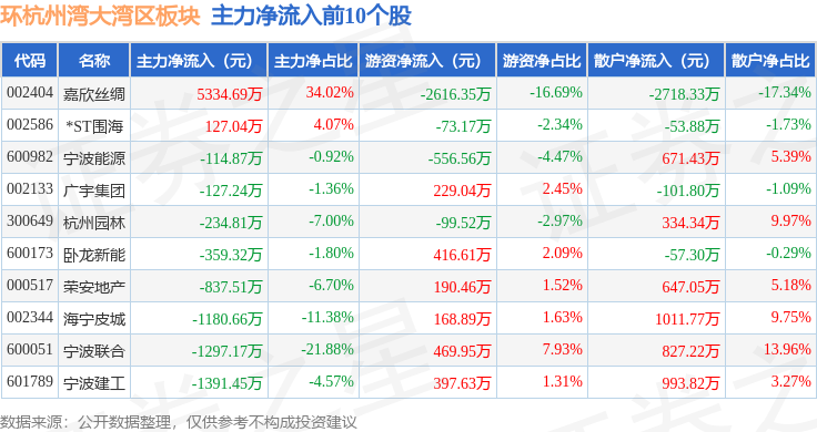 从资金流向上来看,当日环杭州湾大湾区板块主力资金净流出3.11亿元,游资资金净流入1.02亿元,散户资金净流入2.09亿元。环杭州湾大湾区板块个股资金流向见下表:
