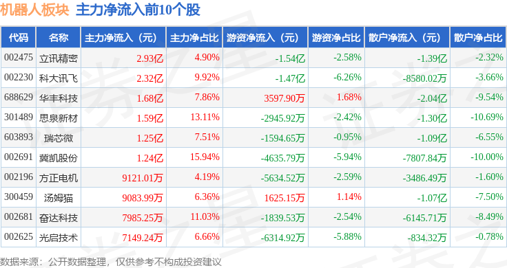 从资金流向上来看,当日机器人板块主力资金净流出81.73亿元,游资资金净流入12.54亿元,散户资金净流入69.18亿元。机器人板块个股资金流向见下表: