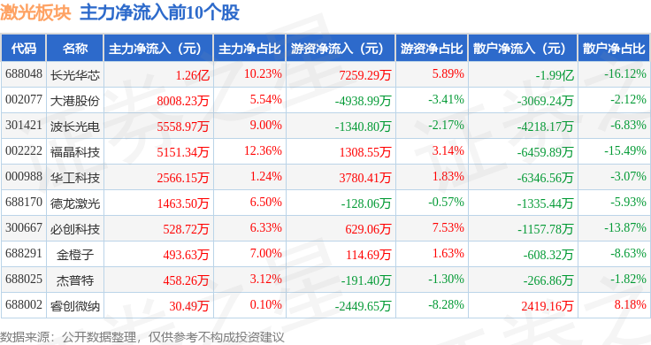 从资金流向上来看,当日激光板块主力资金净流出18.02亿元,游资资金净流入5.59亿元,散户资金净流入12.43亿元。激光板块个股资金流向见下表: