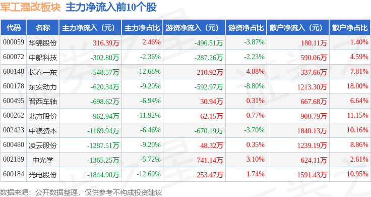 从资金流向上来看,当日军工混改板块主力资金净流出18.11亿元,游资资金净流入6706.84万元,散户资金净流入17.43亿元。军工混改板块个股资金流向见下表: