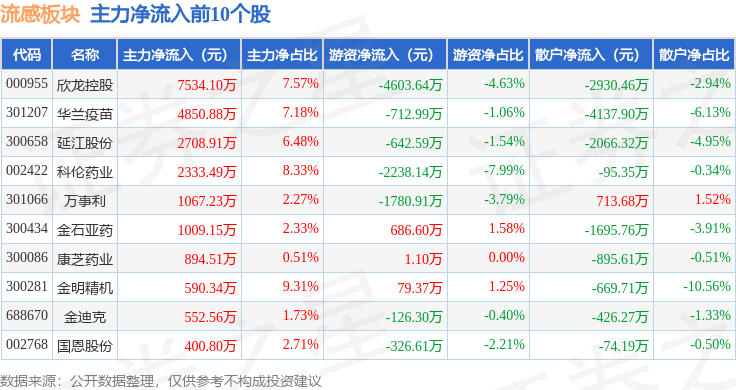 从资金流向上来看,当日流感板块主力资金净流出28.39亿元,游资资金净流入1.75亿元,散户资金净流入26.63亿元。流感板块个股资金流向见下表: