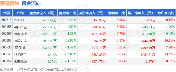 从资金流向上来看,当日赛马板块主力资金净流出5.89亿元,游资资金净流入2.08亿元,散户资金净流入3.81亿元。赛马板块个股资金流向见下表: