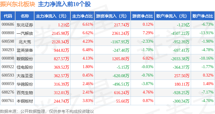 从资金流向上来看,当日振兴东北板块主力资金净流出10.99亿元,游资资金净流入1.84亿元,散户资金净流入9.15亿元。振兴东北板块个股资金流向见下表: