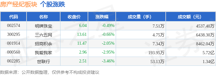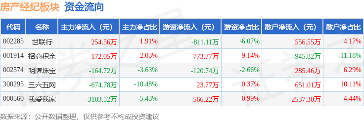 从资金流向上来看,当日房产经纪板块主力资金净流出3516.4万元,游资资金净流入431.91万元,散户资金净流入3084.5万元。房产经纪板块个股资金流向见下表:
