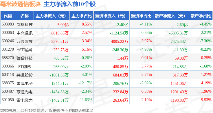 从资金流向上来看,当日毫米波通信板块主力资金净流入5858.8万元,游资资金净流出4547.79万元,散户资金净流出1311.02万元。毫米波通信板块个股资金流向见下表: