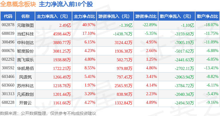 从资金流向上来看,当日全息概念板块主力资金净流出3.17亿元,游资资金净流入2.62亿元,散户资金净流入5472.66万元。全息概念板块个股资金流向见下表: