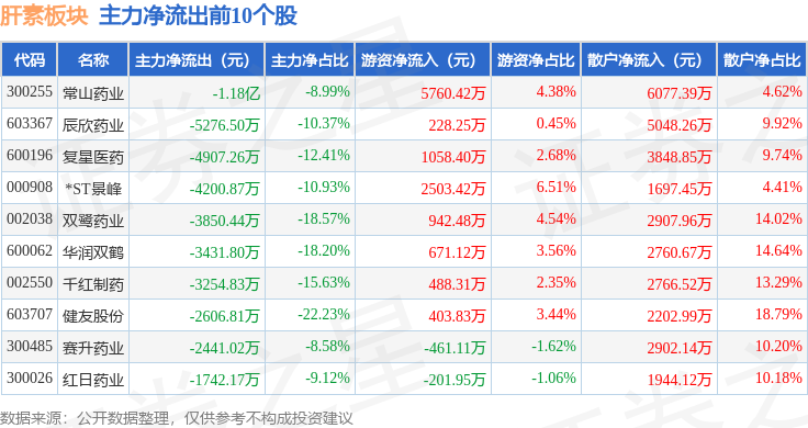 从资金流向上来看,当日肝素板块主力资金净流出4.84亿元,游资资金净流入1.17亿元,散户资金净流入3.67亿元。肝素板块个股资金流向见下表: