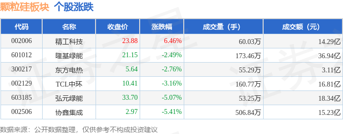 从资金流向上来看,当日颗粒硅板块主力资金净流出10.15亿元,游资资金净流出3492.11万元,散户资金净流入10.5亿元。颗粒硅板块个股资金流向见下表:
