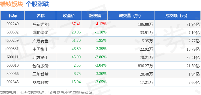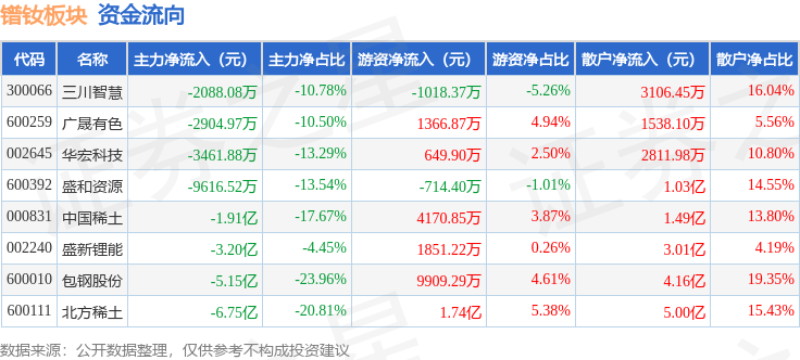 从资金流向上来看,当日镨钕板块主力资金净流出18.81亿元,游资资金净流入3.37亿元,散户资金净流入15.44亿元。镨钕板块个股资金流向见下表: