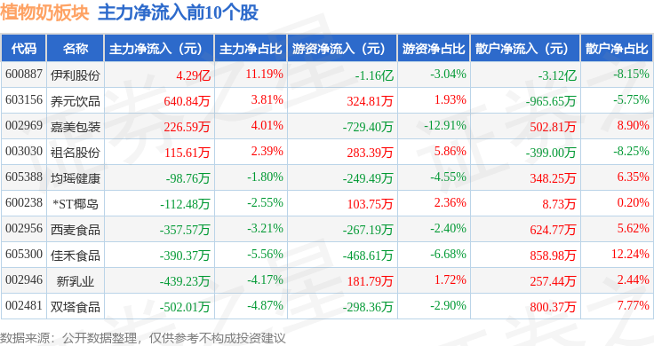 从资金流向上来看,当日植物奶板块主力资金净流入2.94亿元,游资资金净流出1.2亿元,散户资金净流出1.74亿元。植物奶板块个股资金流向见下表: