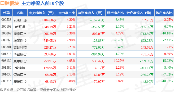 从资金流向上来看,当日口腔板块主力资金净流出7.41亿元,游资资金净流出2361.78万元,散户资金净流入7.65亿元。口腔板块个股资金流向见下表: