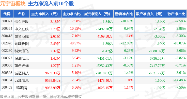 从资金流向上来看,当日元宇宙板块主力资金净流入12.12亿元,游资资金净流出2561.24万元,散户资金净流出11.87亿元。元宇宙板块个股资金流向见下表: