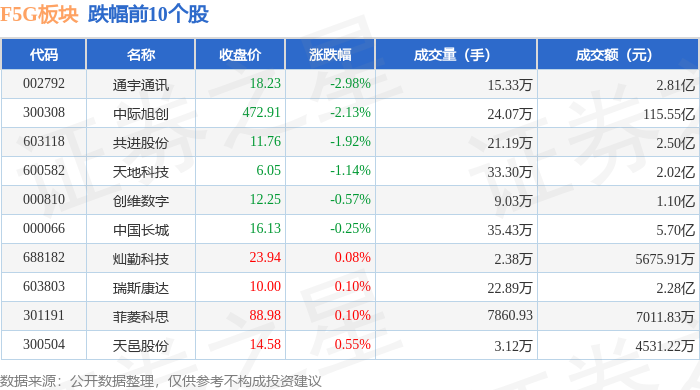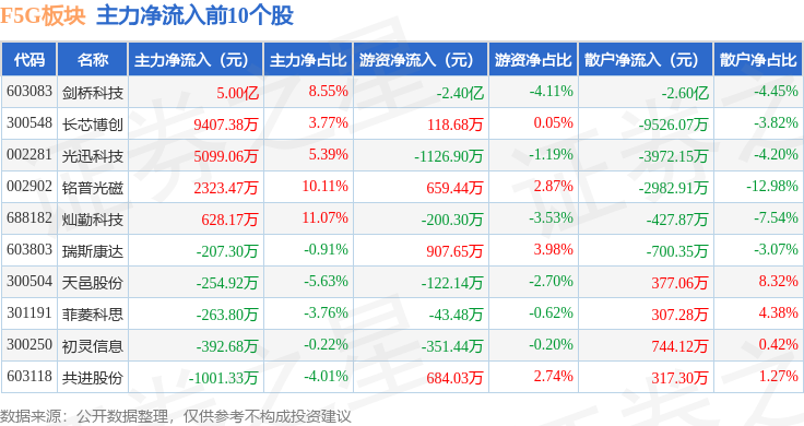 从资金流向上来看,当日F5G板块主力资金净流入4.37亿元,游资资金净流出1.34亿元,散户资金净流出3.03亿元。F5G板块个股资金流向见下表: