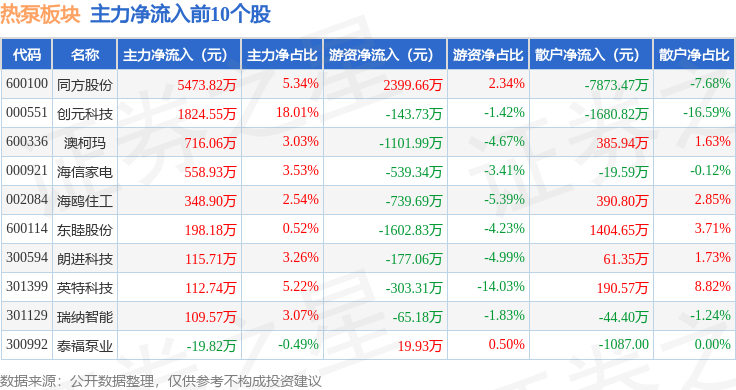 从资金流向上来看,当日热泵板块主力资金净流出12.02亿元,游资资金净流入1.45亿元,散户资金净流入10.57亿元。热泵板块个股资金流向见下表: