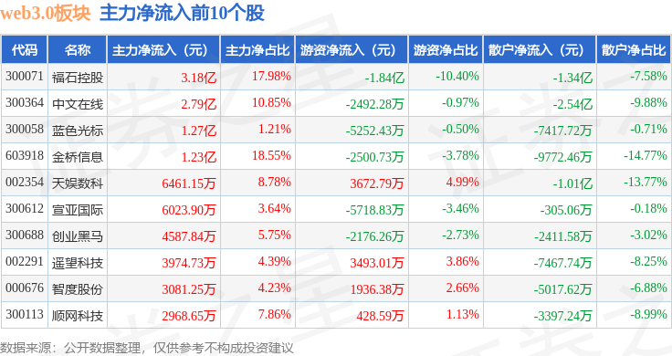 从资金流向上来看,当日web3.0板块主力资金净流入6.13亿元,游资资金净流入42.75万元,散户资金净流出6.13亿元。web3.0板块个股资金流向见下表: