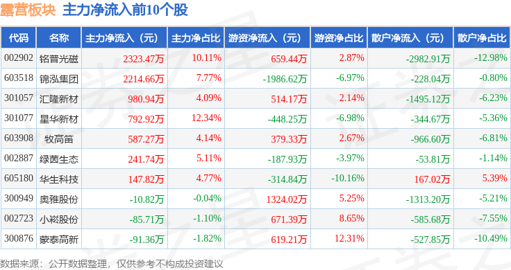 从资金流向上来看,当日露营板块主力资金净流出4.42亿元,游资资金净流出405.22万元,散户资金净流入4.46亿元。露营板块个股资金流向见下表: