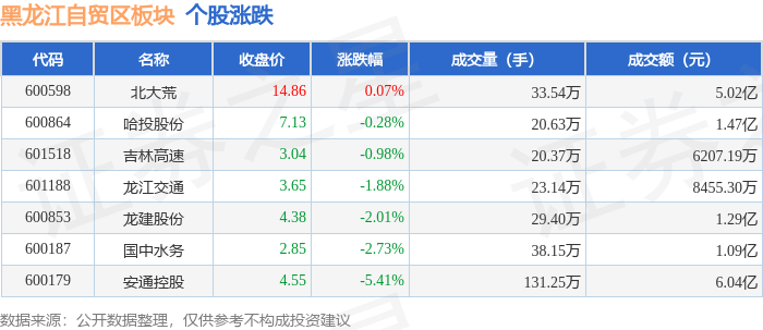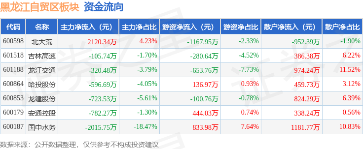 从资金流向上来看,当日黑龙江自贸区板块主力资金净流出2424.13万元,游资资金净流出788.12万元,散户资金净流入3212.25万元。黑龙江自贸区板块个股资金流向见下表: