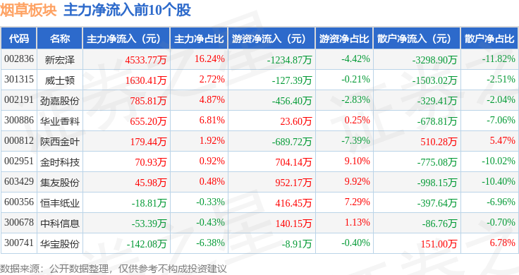从资金流向上来看,当日烟草板块主力资金净流出5.56亿元,游资资金净流入1.35亿元,散户资金净流入4.21亿元。烟草板块个股资金流向见下表: