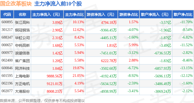 从资金流向上来看,当日国企改革板块主力资金净流出239.92亿元,游资资金净流入39.6亿元,散户资金净流入200.32亿元。国企改革板块个股资金流向见下表: