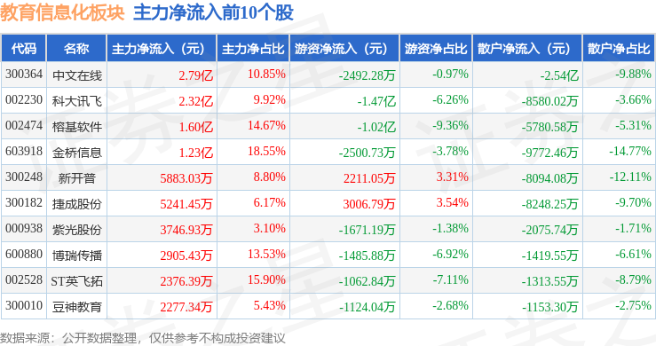 从资金流向上来看,当日教育信息化板块主力资金净流入4.35亿元,游资资金净流入6726.09万元,散户资金净流出5.02亿元。教育信息化板块个股资金流向见下表: