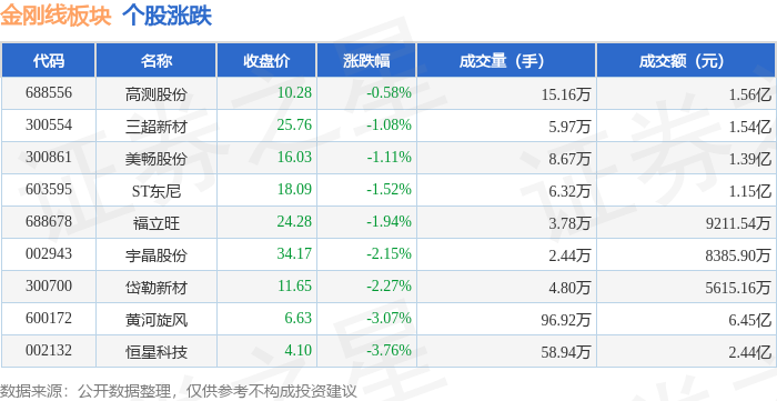 证券之星消息,11月18日金刚线板块较上一交易日下跌1.98%,恒星科技领跌。当日上证指数报收于3939.81,下跌0.81%。深证成指报收于13080.49,下跌0.92%。金刚线板块个股涨跌见下表: