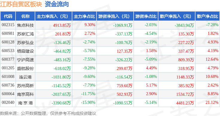 从资金流向上来看,当日江苏自贸区板块主力资金净流出4182.42万元,游资资金净流出1352.17万元,散户资金净流入5534.59万元。江苏自贸区板块个股资金流向见下表:
