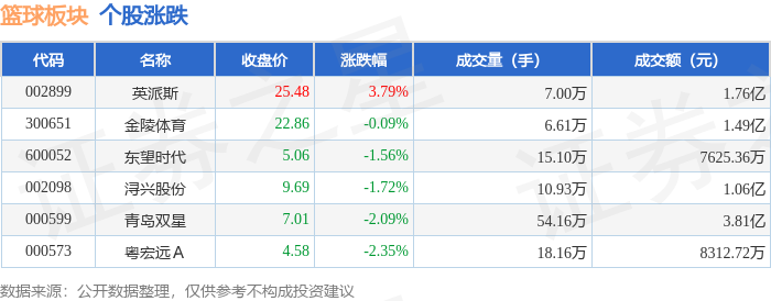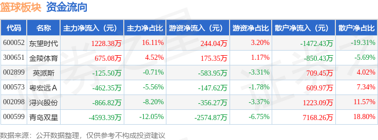 从资金流向上来看,当日篮球板块主力资金净流出4144.59万元,游资资金净流出3243.32万元,散户资金净流入7387.91万元。篮球板块个股资金流向见下表: